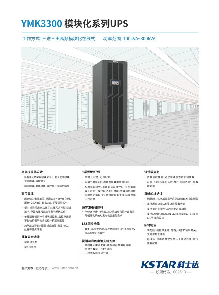 隨著中小型數(shù)據(jù)中心與邊際核算的快速發(fā)展,場景對 UPS 不間斷電源的需求持續(xù)增長,科士達 YMK3300 插框系列三進三出UPS電源(30kVA~150kVA),以 “模塊化靈活擴容、高頻*節(jié)能、易運維高可靠” 的中心優(yōu)勢,持續(xù)為這些場景保駕護航。作為專業(yè)的科士達UPS電源,它不只解決了中小型場景的電力痛點,還為用戶降低了成本與運維難度,充分彰顯了 UPS 不間斷電源在關(guān)鍵場景中的重要價值。未來,科士達將持續(xù)優(yōu)化該系列UPS電源的性能,結(jié)合場景智能化需求,推出更貼合用戶需求的功能,讓科士達UPS電源在更多中小型場景中發(fā)揮價值,助力數(shù)字基礎(chǔ)設(shè)施安穩(wěn)發(fā)展。