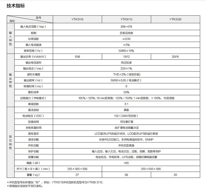 作為適應(yīng)復(fù)雜電網(wǎng)的UPS電源,其中心優(yōu)勢在于*環(huán)境適應(yīng)性:輸入電壓規(guī)模寬至 138-485V(線電壓)、80-280V(相電壓),頻率適配 40-70Hz,可自動兼容 50/60Hz 電網(wǎng),即便面對電壓動搖、頻率漂移等惡劣狀況,仍能穩(wěn)定輸出 208-240Vac 純凈正弦波,輸出波形畸變率低于 2%(線性負(fù)載),有效保護(hù)精密儀器免受電網(wǎng)干擾。市電與電池切換完成 0ms 無縫銜接,旁路逆變切換僅 1ms,確保負(fù)載供電零中斷,這一特性使該UPS電源成為醫(yī)療、交通等關(guān)鍵領(lǐng)域的優(yōu)選。